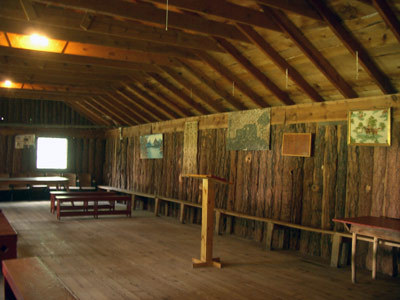 Dining lodge seats 65 persons on a classic pine floor and hand-made furnishings. More seating available on the comforable shaded porch.